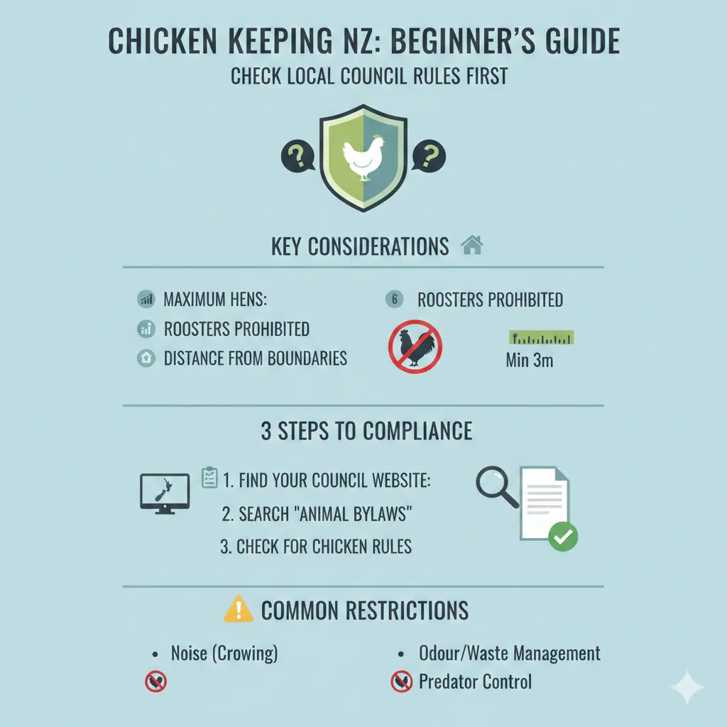 Before you buy a single chicken, you'll need to check what your local council allows. Each council in New Zealand has its own rules about chicken keeping, and they vary significantly depending on where you live. This is the most important first step, so don't skip it.