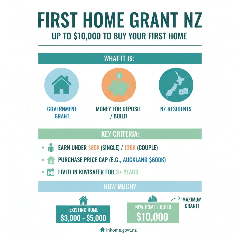 Buying your first home is one of the biggest financial decisions you'll make, and the New Zealand government wants to help. The First Home Grant puts up to $10,000 directly towards your deposit, makin...