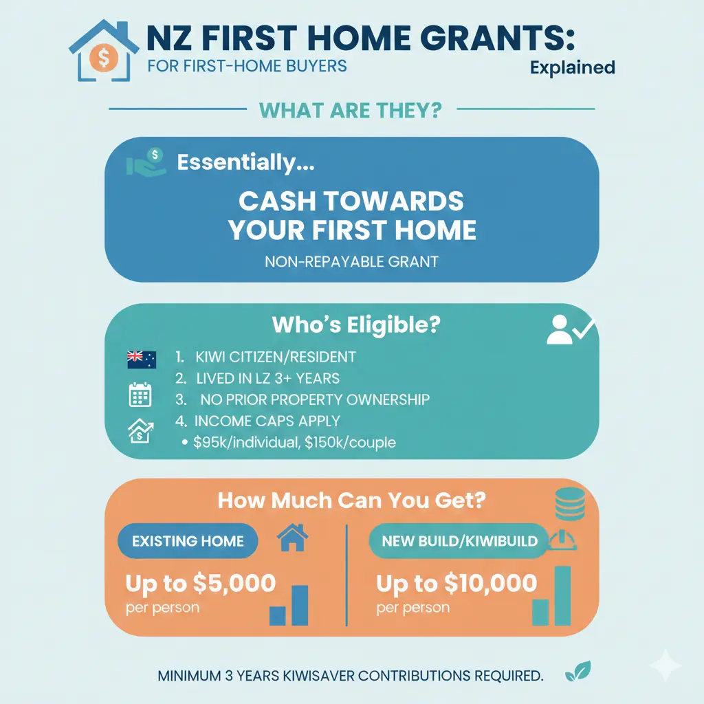 Buying your first home is one of the biggest financial decisions you'll make, and the New Zealand government wants to help. The First Home Grant puts up to $10,000 directly towards your deposit, makin...