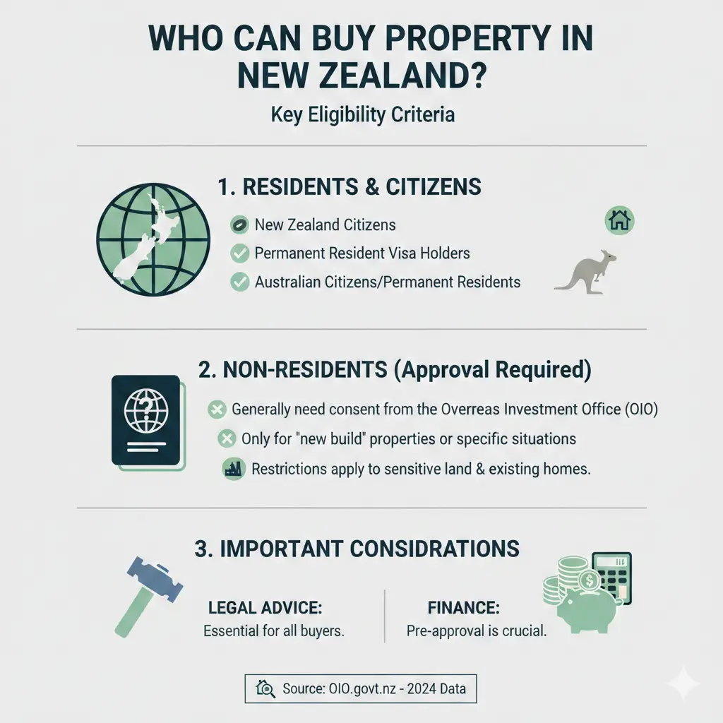 Not everyone can jump straight into the market. Since 2018, New Zealand has restricted foreign buyers from purchasing existing residential properties to prioritise local housing needs.[1][2] Citizens, permanent residents, and those 'ordinarily resident' (meeting specific criteria like living here for 183 days per year) can buy freely.[5]