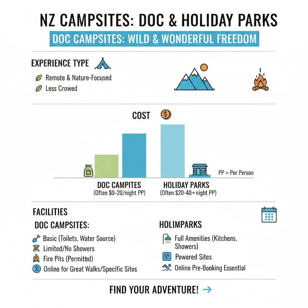 What's the difference between DOC and holiday parks? DOC is basic, nature-focused ($8-20); holiday parks offer power/showers ($40-70).