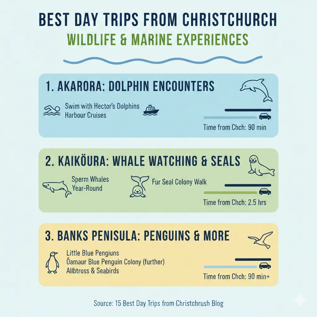 Christchurch is perfectly positioned as a gateway to some of New Zealand's most spectacular natural attractions. Whether you're a local looking for a weekend escape or a visitor with limited time, the South Island offers incredible day trip options within easy reach of the city. From whale watching in Kaikoura to hiking beneath the Southern Alps, here are 15 of the best day trips from Christchurch that'll make your adventure unforgettable.