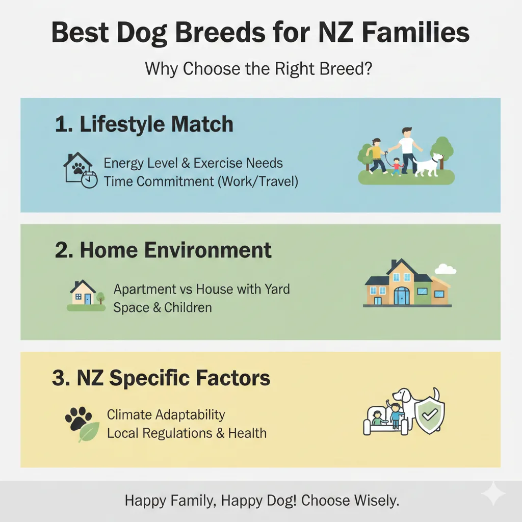Assess your yard, kids' ages, and exercise routine. Visit SPCA centres, chat with breeders via NZKC.org.nz, and trial daycare at places like Auckland Kennels. Budget for microchipping ($50-100) and start training day one. Your new mate awaits—happy tails!