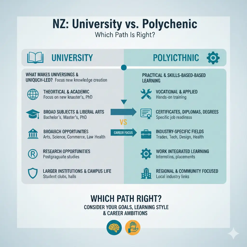 Choosing between a university and a polytechnic in New Zealand can feel like standing at a crossroads, with your future career hanging in the balance. Whether you're a school leaver eyeing your first qualification, a career changer seeking practical skills, or a parent guiding your teen, understanding the real differences will help you pick the path that suits your goals, lifestyle, and budget.