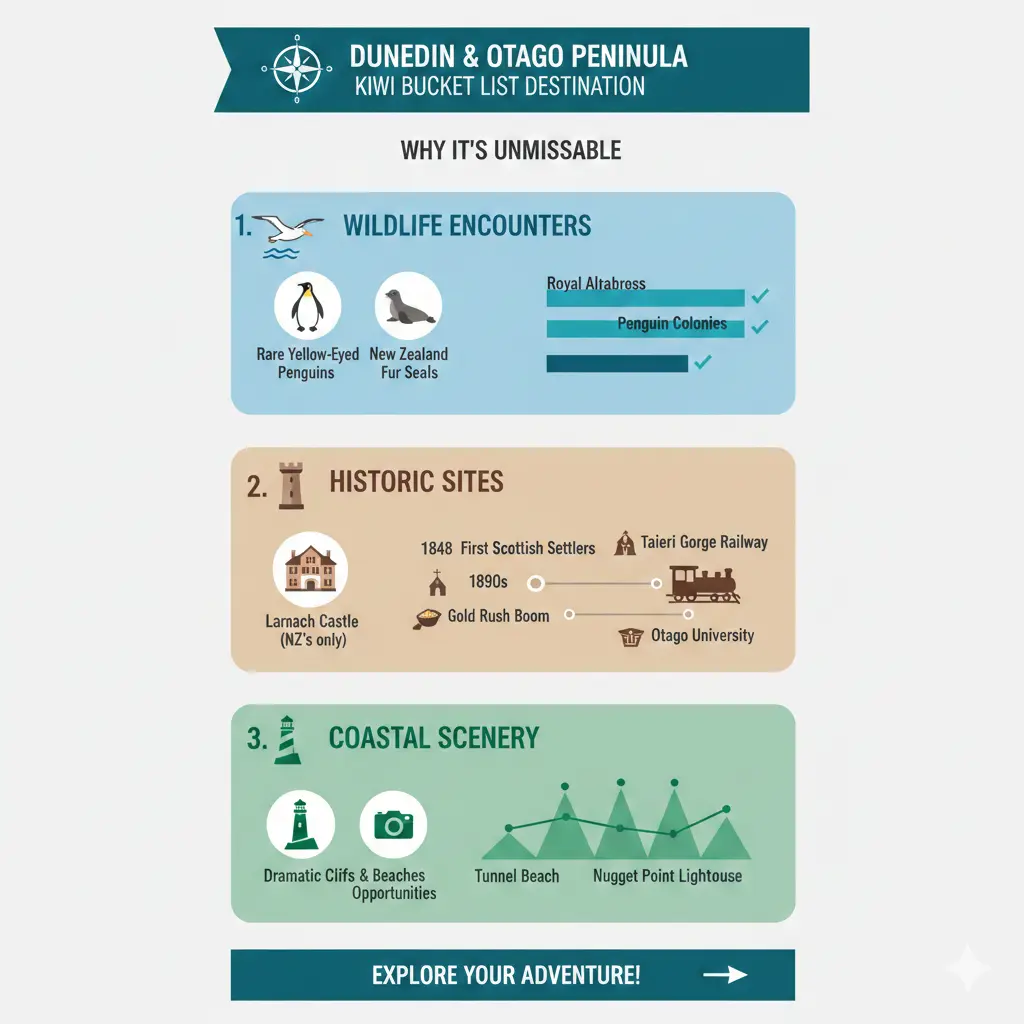 Imagine cruising along rugged cliffs where royal albatross soar overhead, spotting yellow-eyed penguins waddling home at dusk, and stepping into a fairy-tale castle perched on a hilltop—all just a sho...