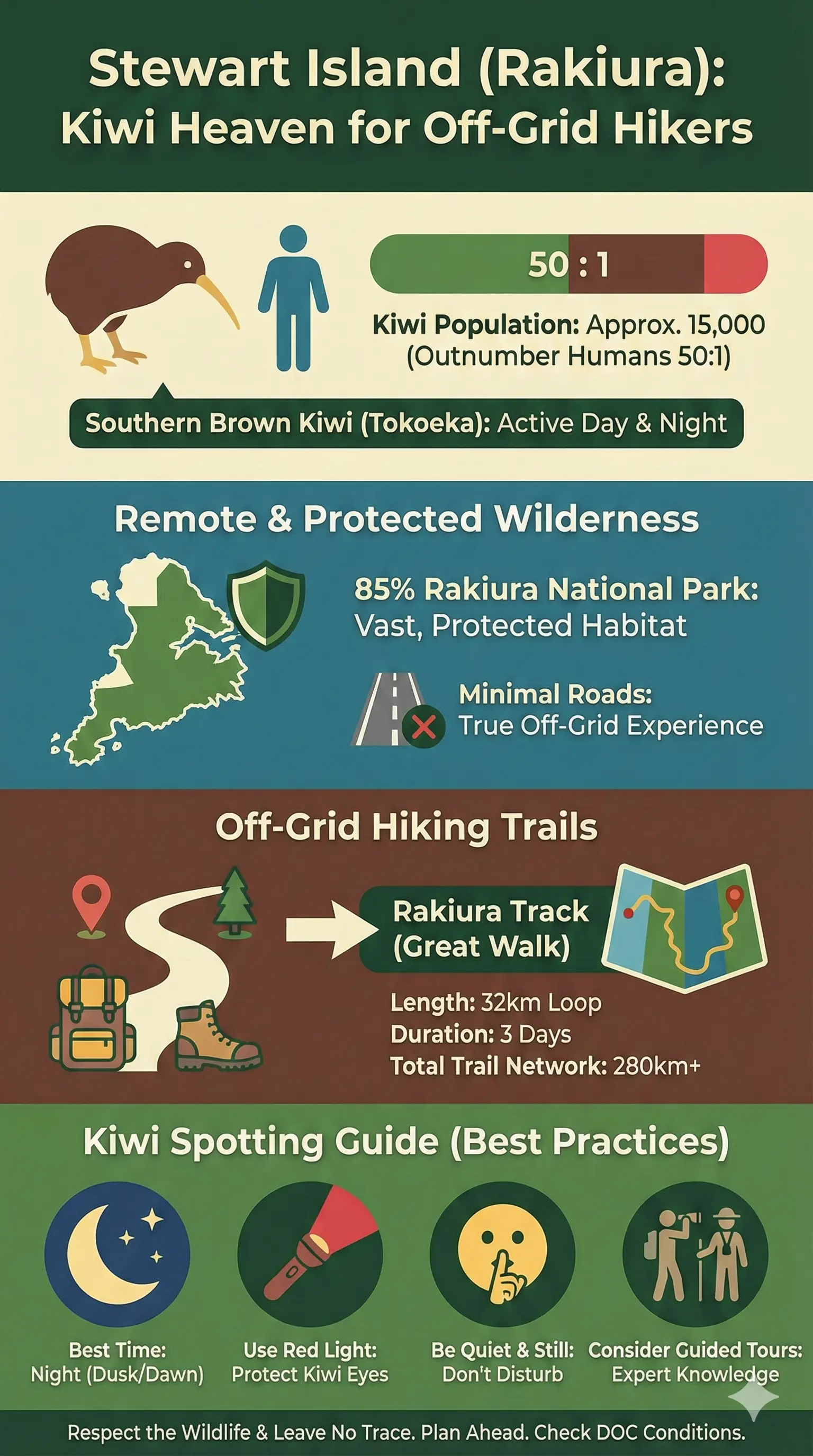 Stewart Island covers 1,746 square kilometres, with 85% protected as Rakiura National Park, offering pristine forests, untouched beaches, and abundant wildlife.Rakiura Track, one of New Zealand's nine Great Walks, is the star attraction for off-grid hiking – a 32km loop that's achievable for moderate fitness levels over three days.[1][7]