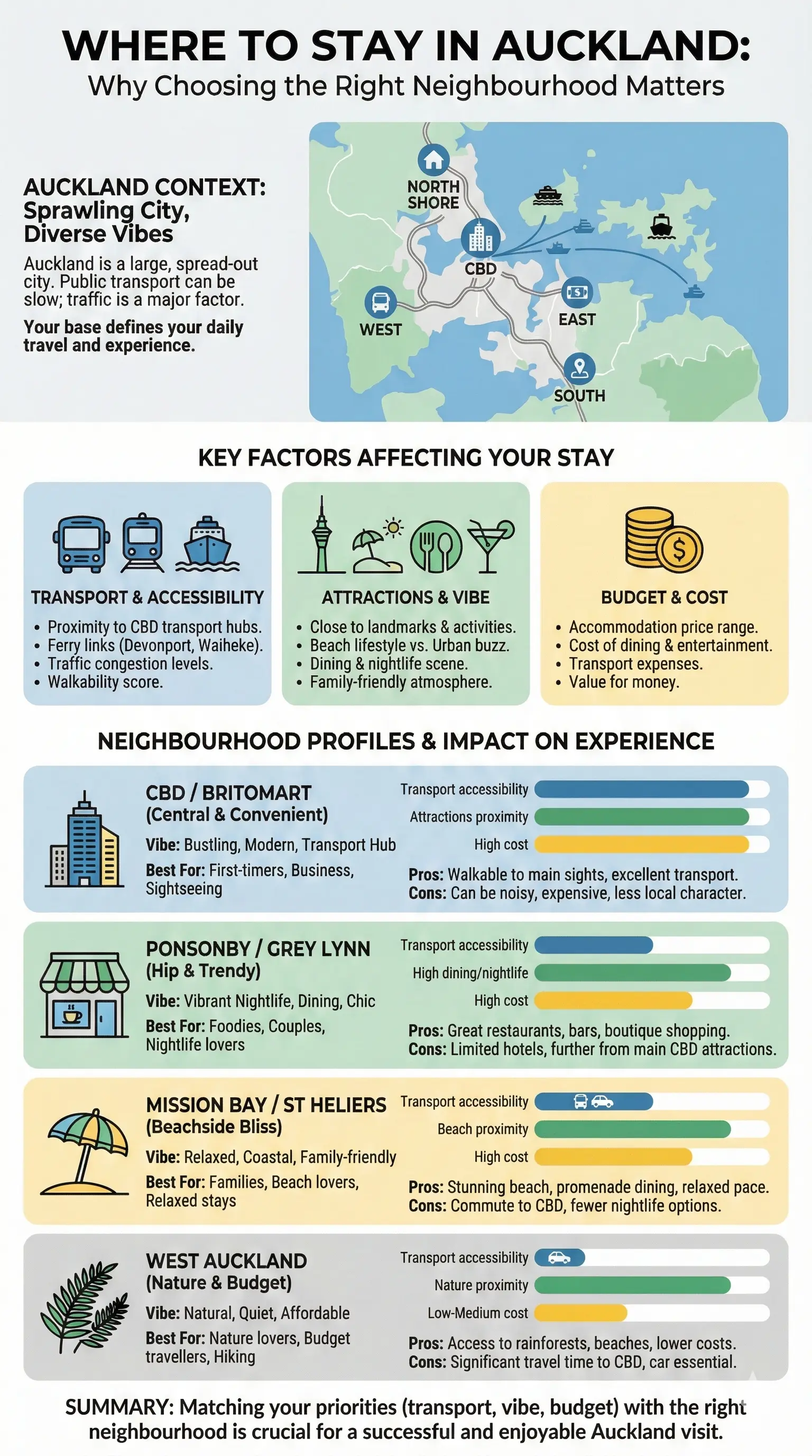 Auckland's sprawl means transport can eat into your time and wallet—think peak-hour buses or pricey Ubers across the harbour bridge. Picking the right spot keeps you close to beaches, eateries, and sights without the hassle. For locals dipping back into the city or visitors from the South Island, neighbourhoods like Ponsonby or Parnell blend Kiwi charm with convenience, all while suiting budgets from backpacker to flashpacker.[1][2]