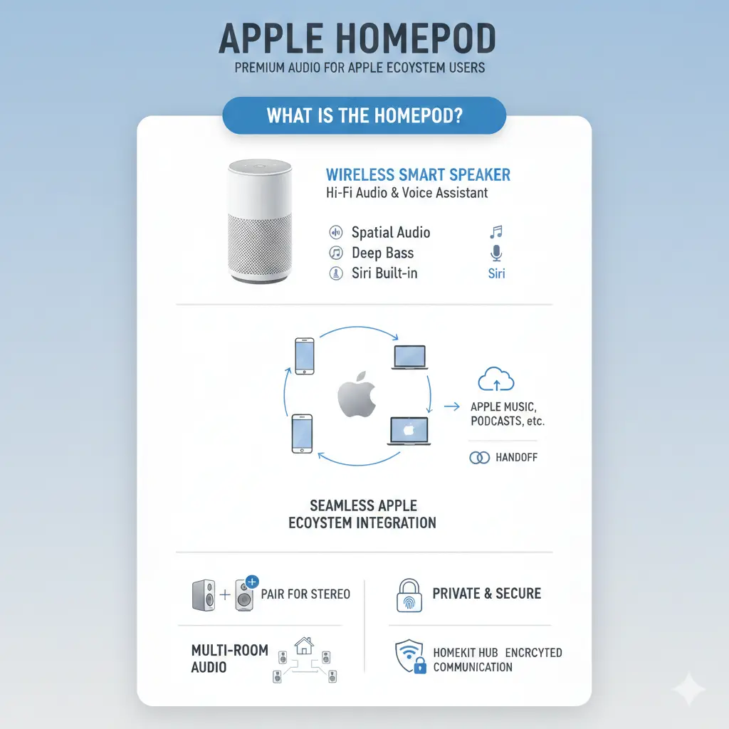 The HomePod is Apple's premium smart speaker designed specifically for users already invested in the Apple ecosystem. Unlike generic smart speakers, the HomePod combines exceptional audio quality with Siri voice control and HomeKit integration, making it more than just a music player—it's a central hub for your smart home.[1]