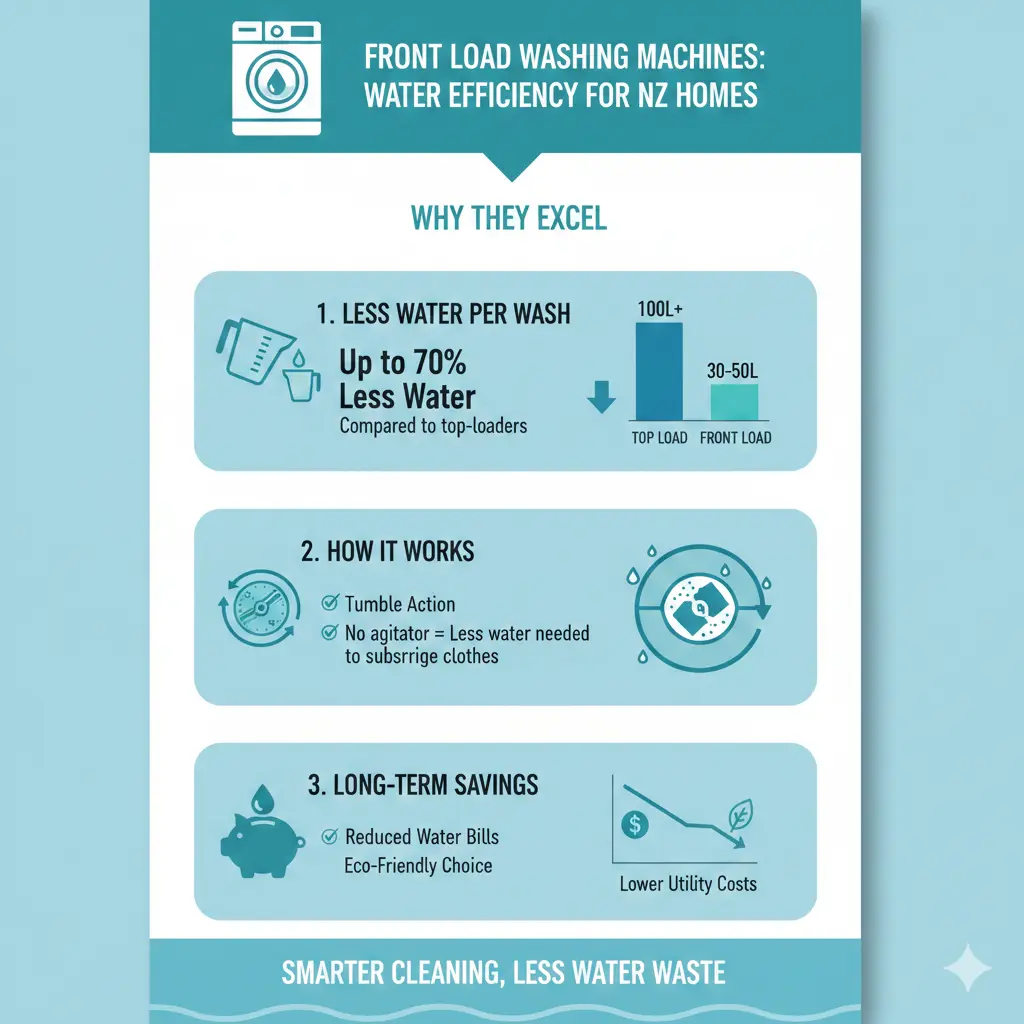 Unlike top loaders that submerge clothes in water, front load washing machines use a tumbling action powered by gravity, requiring far less water per cycle.Front loaders typically use 30-50% less water than traditional models, making them ideal for NZ households facing water restrictions or high usage fees.[2][6]
