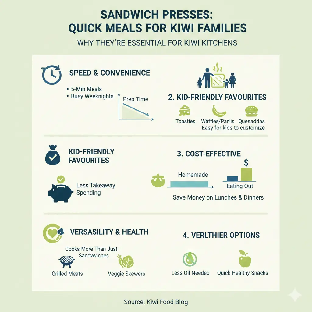 For Kiwi families juggling busy schedules, a sandwich press is more than just a kitchen gadget—it's a practical investment in convenience and nutrition. Whether you're preparing quick weekday lunches, after-school snacks, or weekend brunch, a quality sandwich press delivers consistent, delicious results without the fuss.