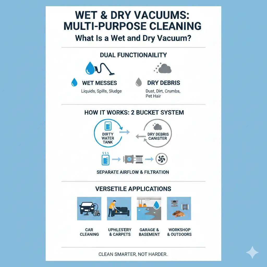 A wet and dry vacuum is a multi-purpose cleaning tool designed to handle both wet and dry messes[1]. Unlike traditional household vacuums that can only manage dust, crumbs, and dirt, wet and dry vacuums actively extract water and can pick up liquid spills, mud, and larger debris[1]. Many modern models combine vacuuming and mopping functionality, allowing you to clean floors in a single pass rather than vacuuming first and mopping separately[2].