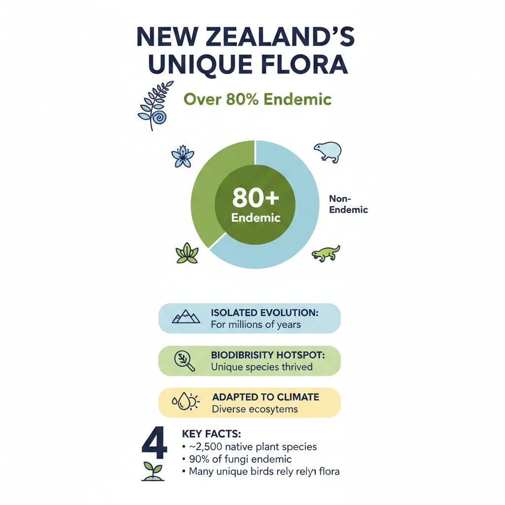 - New Zealand has a high level of endemism: Over 80% of the country's flora is found nowhere else in the world.
