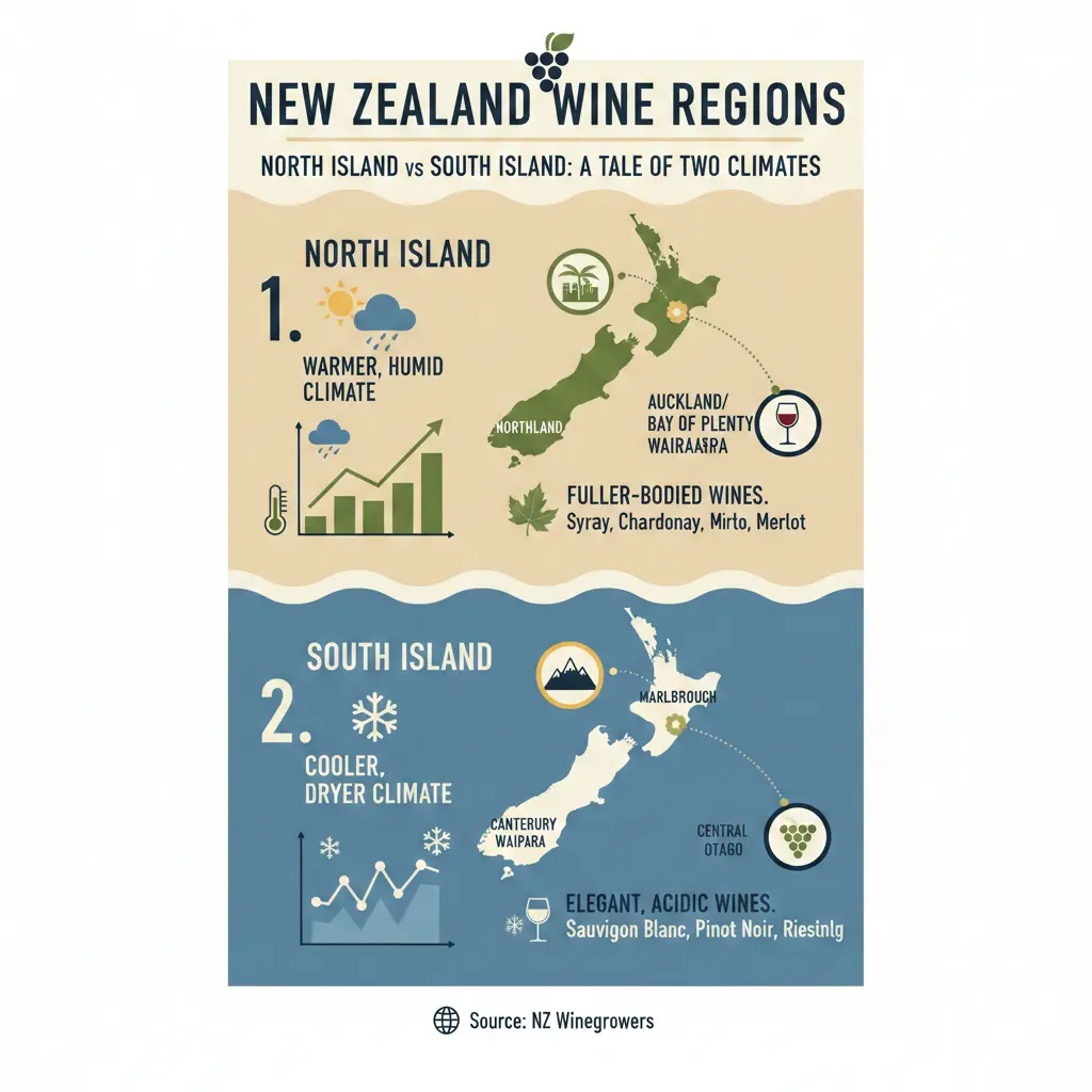 New Zealand's wine story splits neatly across our two main islands, each shaped by maritime breezes, long sunshine hours, and cool nights that deliver fruit purity and finesse.