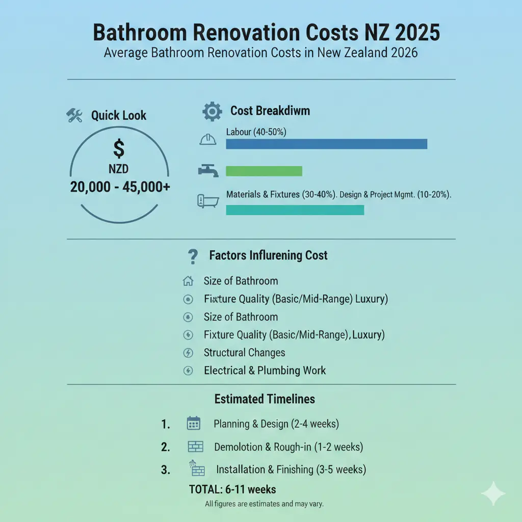 These figures factor in 2026 material hikes—tiles up 10% due to imports—and labour shortages in regions like Christchurch and Wellington. For a small 5sqm loo, you're looking at the lower end; powder rooms or ensuites with spa features push it higher.