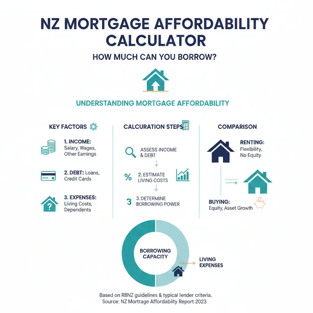 Mortgage affordability isn't just about your salaryโit's a mix of income, expenses, deposit size, and current lending rules set by the Reserve Bank of New Zealand (RBNZ). Banks assess your ability to repay over the long term, often stress-testing at higher interest rates to ensure you're covered if rates rise.[1][3]
