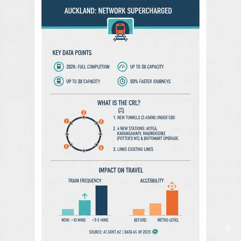 Auckland's public transport is evolving fast. The City Rail Link (CRL) – our country's first metro system – opens in 2026, linking Waitematā Station to Maungawhau via new underground stations at Karanga-a-Hape and Te Waihorotiu. Expect faster journeys, more frequent trains, and world-class facilities.[1][2][4]