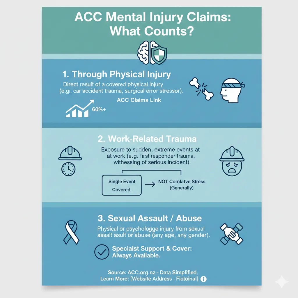 ACC defines a mental injury as a diagnosable condition like post-traumatic stress disorder (PTSD), anxiety, or depression directly caused by a physical injury, treatment injury, sexual abuse, or specific work-related events. Unlike general stress, ACC cover is tightly regulated by the Accident Compensation Act 2001, particularly sections 20-27, which outline personal injury criteria.