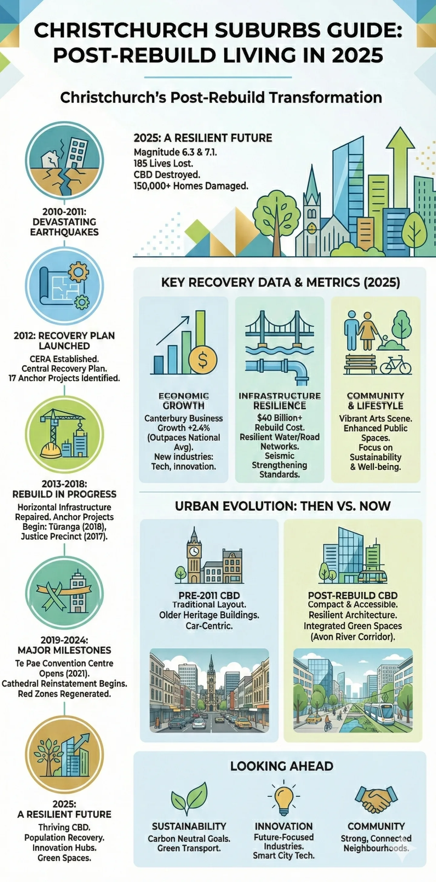 Christchurch has risen from the ashes of the 2011 earthquakes, emerging in 2026 as a vibrant, resilient city with modern infrastructure and thriving suburbs. Whether you're a Kiwi family eyeing a forever home, an investor chasing strong yields, or a first-home buyer navigating the market, this Christchurch Suburbs Guide: Post-Rebuild Living in 2025 breaks down the best spots for post-rebuild living, backed by the latest data on growth, amenities, and finances.