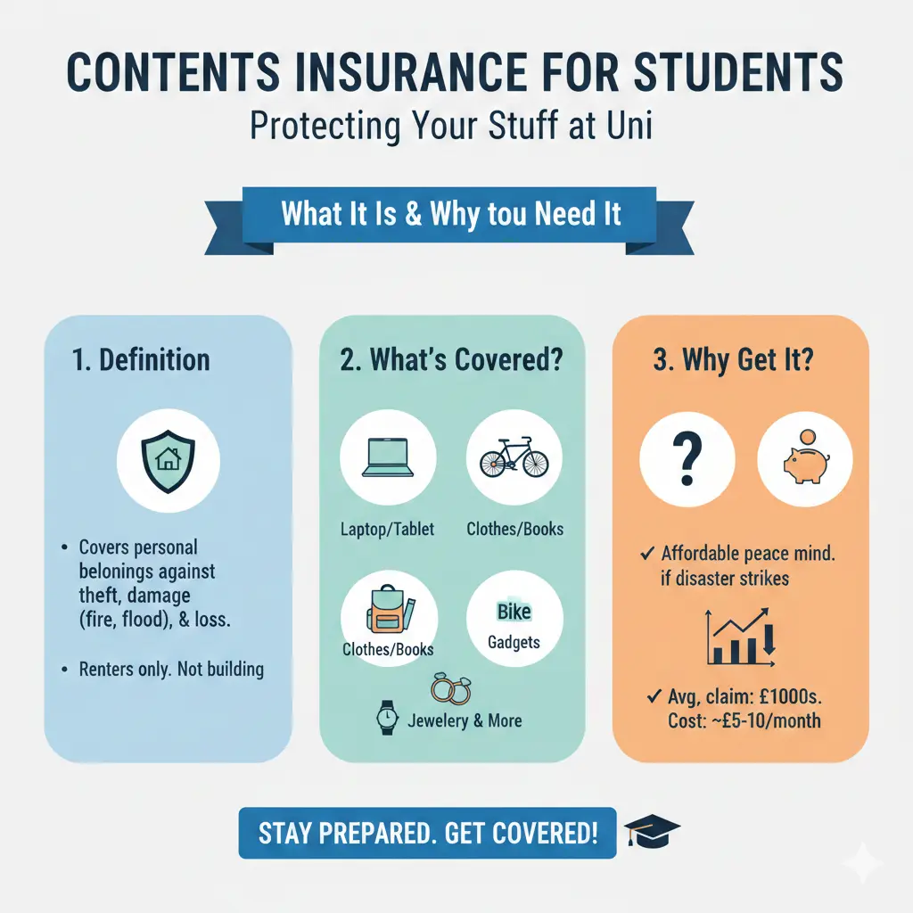 Contents insurance for students—often just called student insurance—is a policy that covers your personal belongings against theft, damage, fire, or loss while you're living away from home.[3] It's not the same as your landlord's insurance, which typically only protects their fixtures like beds or whiteware in furnished rentals.[3]