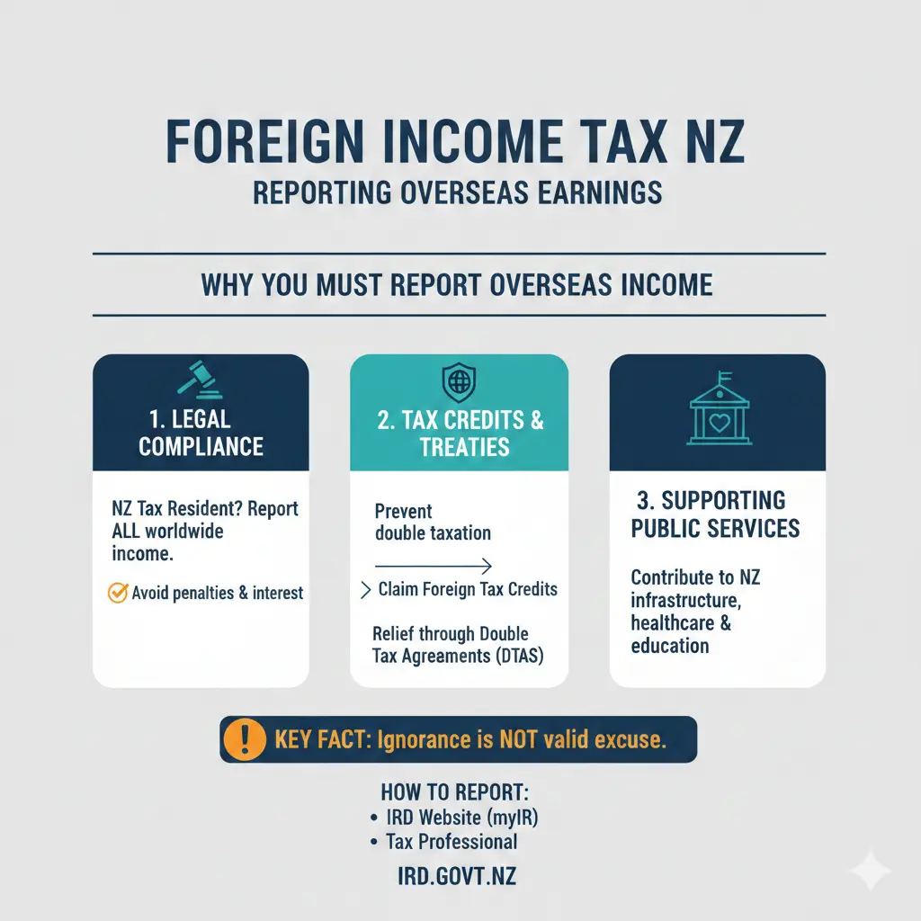 The good news? New Zealand has a foreign tax credit system that recognises tax you've already paid overseas. This prevents you from being taxed twice on the same income, though you'll need to claim it correctly to benefit.[1]
