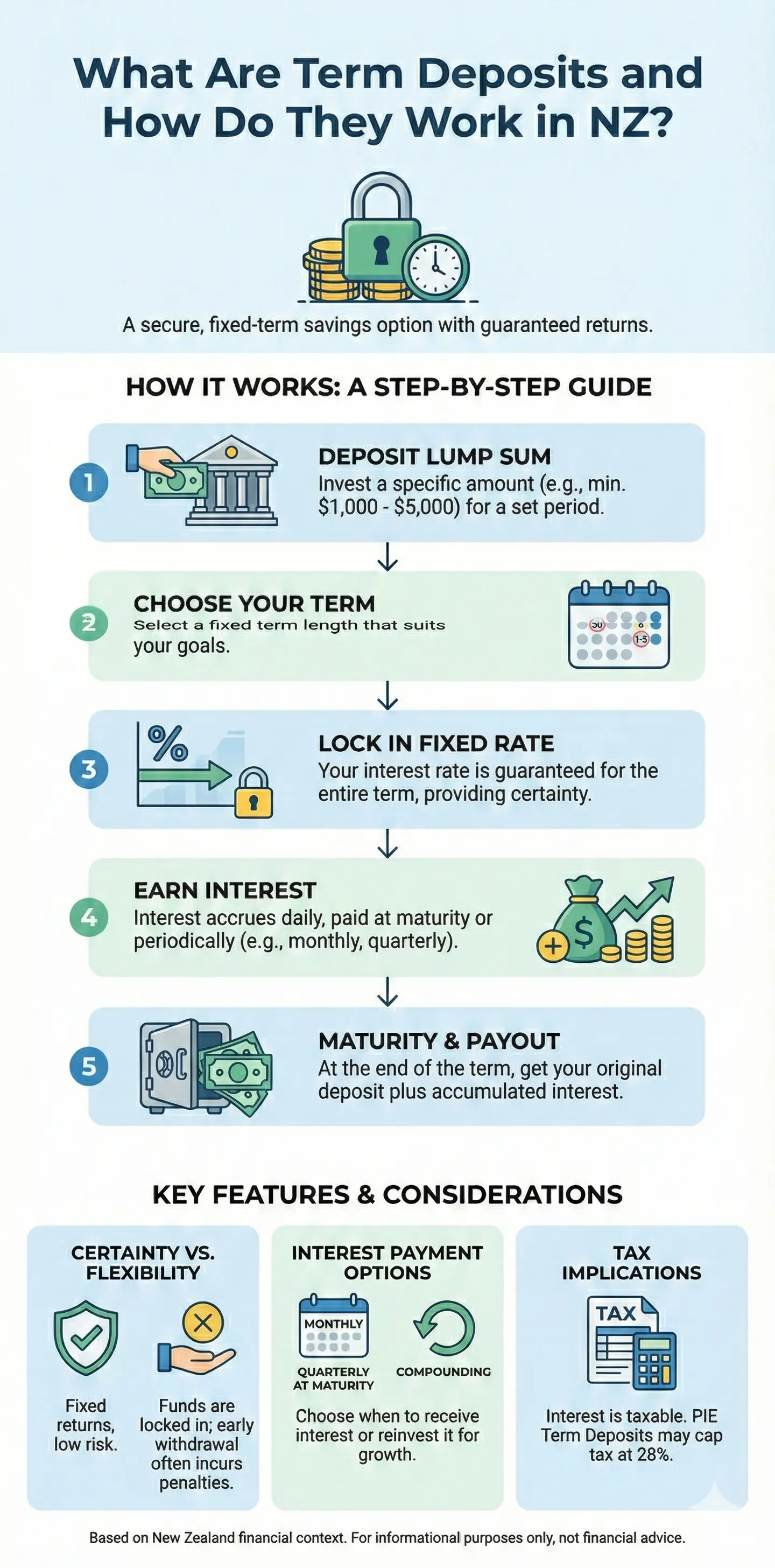 Term deposits offer the security of fixed returns with no market ups and downs, ideal if you hate surprises.KiwiSaver, however, shines for long-term growth but locks away funds until retirement or specific withdrawals, making it less suitable for short horizons. This guide breaks it down with 2026 rates, real Kiwi examples, and actionable steps tailored to our market.