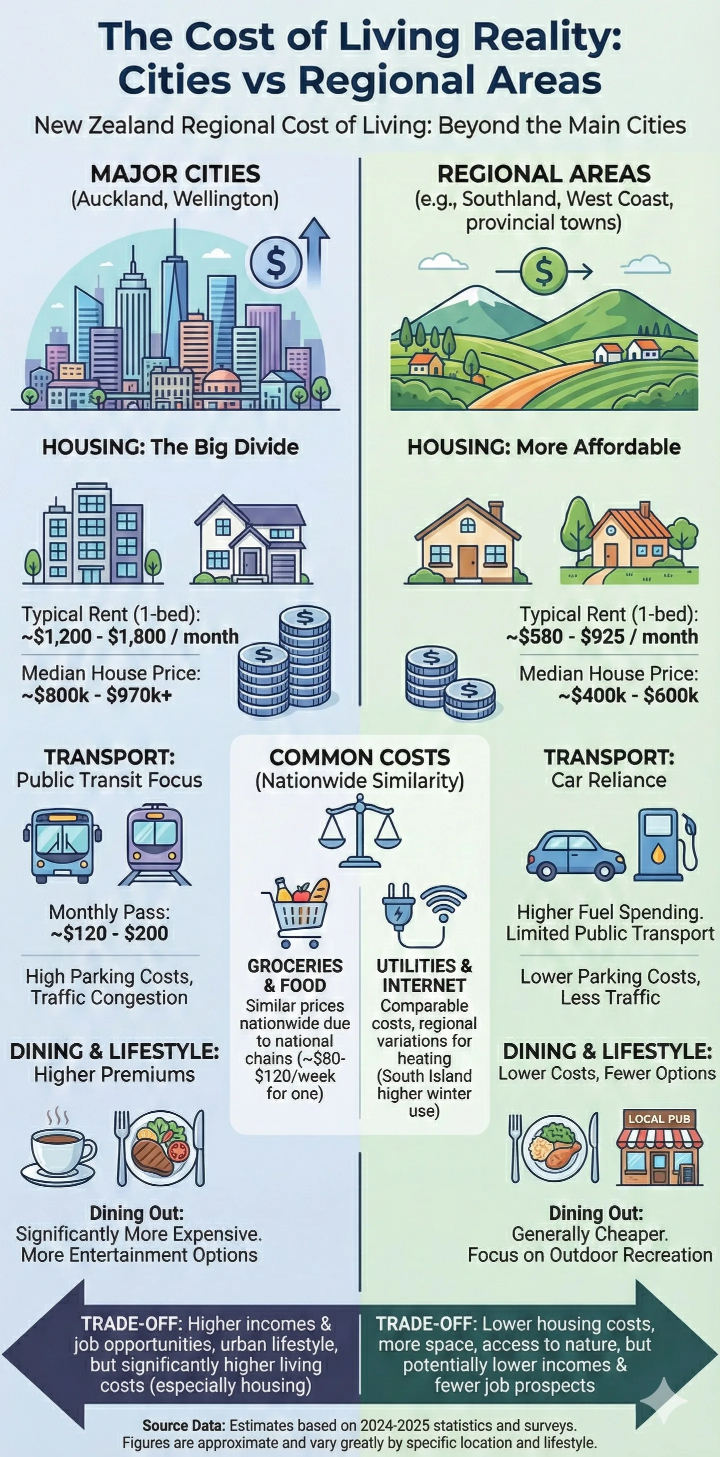 For a solo working professional in a medium-cost city, expect monthly expenses between NZ$1,800 and NZ$2,500. However, regional areas can bring this down significantly. The key is understanding which regions offer the best value for your lifestyle and work situation.