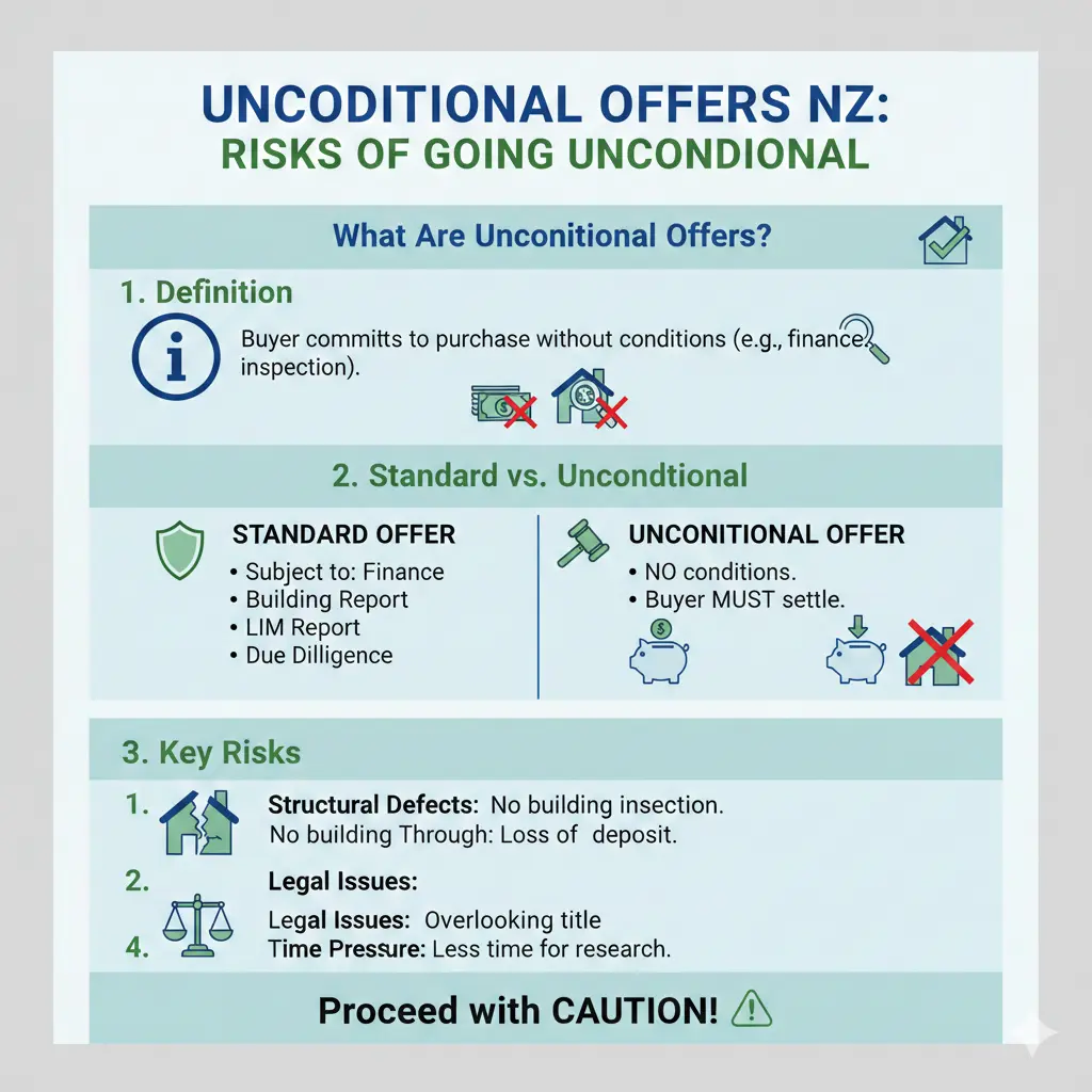 In New Zealand's competitive property landscape of 2026, unconditional offers are a double-edged sword. They're a powerful tool to secure a property at auction or against multiple bidders, but they come with steep risks of going unconditional. Without protective conditions, you're legally bound, potentially facing financial ruin if things go wrong. This guide breaks down the pitfalls, real-life examples, and practical steps to protect yourself when navigating Unconditional Offers NZ.