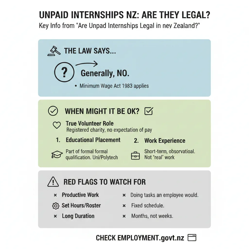 The Employment Relations Act doesn't specifically define internships, which creates a grey area that some employers exploit. According to Employment New Zealand, unpaid interns aren't considered employees and therefore aren't covered by standard employment law. However, this doesn't mean they have zero protections.