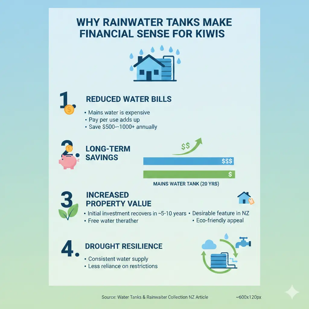Factor in KiwiSaver-like long-term thinking: tanks hedge against future rate hikes as water scarcity grows. Use online calculators from suppliers to estimate your payback based on roof size and local rainfall.[2]