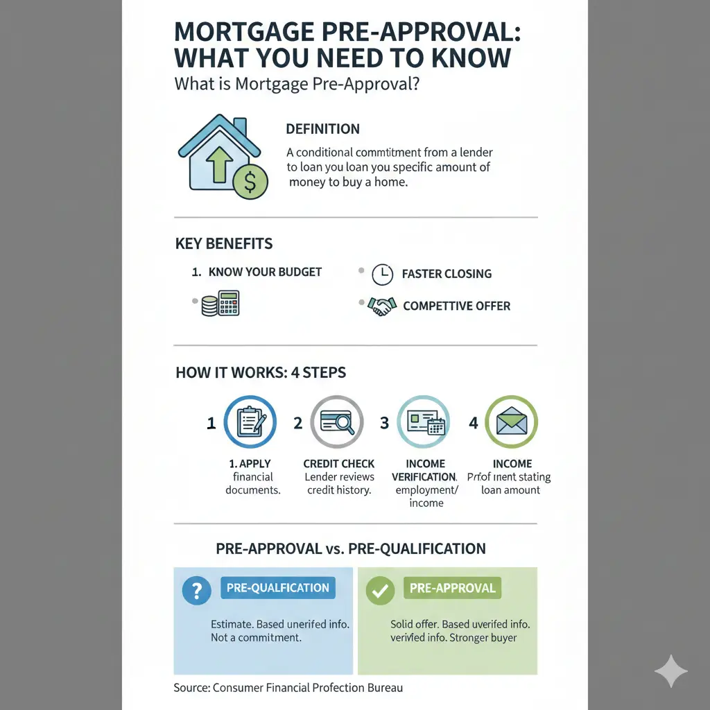 Mortgage pre-approval is a lender's written confirmation of how much they're willing to lend you, based on your financial situation—before you've even found a property.[1][2] It's not a full loan offer, but a conditional green light that typically lasts 60-90 days.[1]