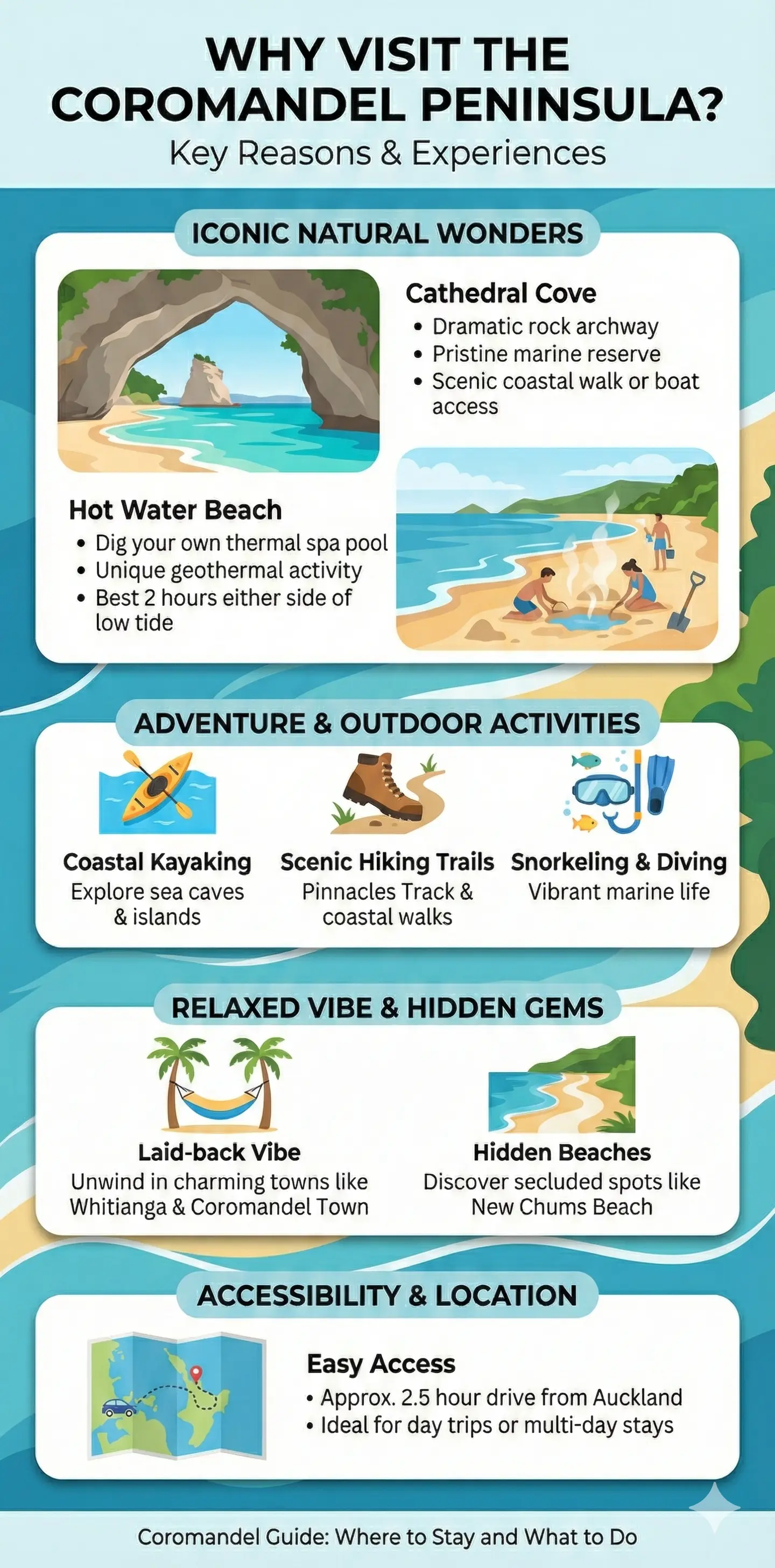 Imagine waking up to the sound of waves crashing on golden sands, with the rugged peaks of the Coromandel Peninsula stretching out before you. Whether you're a Kiwi chasing a weekend getaway or planning a longer family adventure, this Coromandel Guide: Where to Stay and What to Do has you covered with practical tips tailored for us locals.