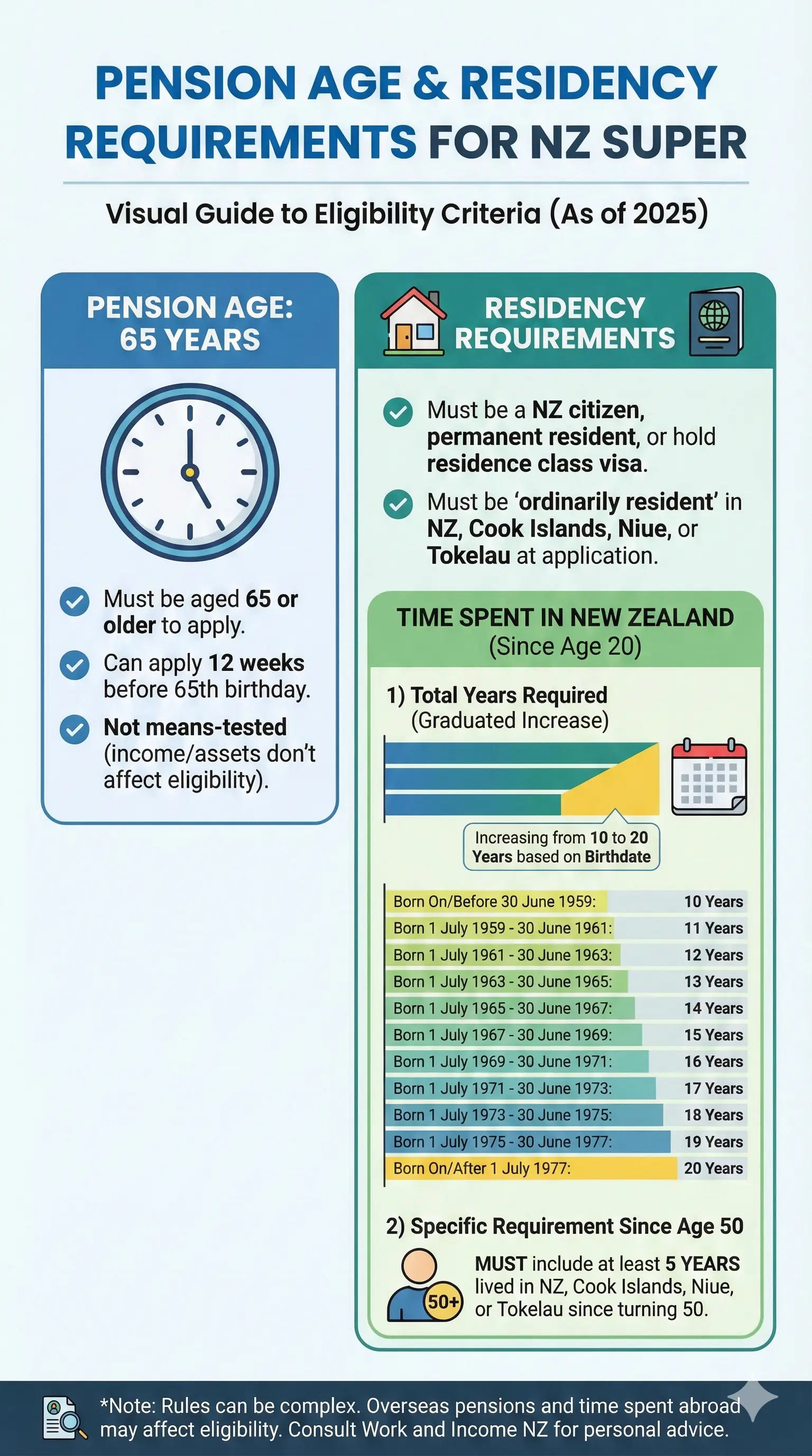 No matter your birth date, the 5-year rule is non-negotiable: at least 5 of your required years must be after turning 50. This focuses on recent connections to New Zealand, ensuring you've built a life here in your later working years.[2][3][6]