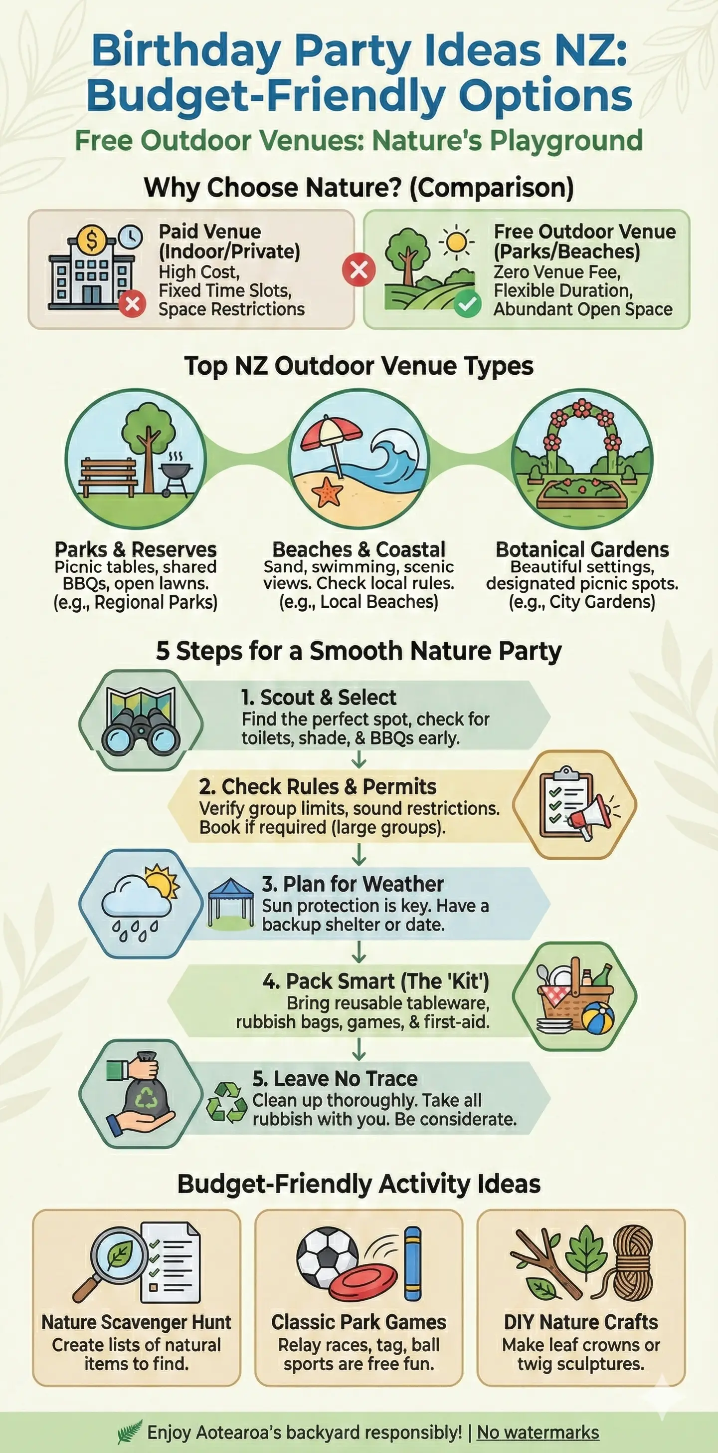 Our parks, beaches, and playgrounds are gold for budget parties. No entry fees mean more cash for cake and sausages – perfect for Kiwi families watching the pennies in 2026.
