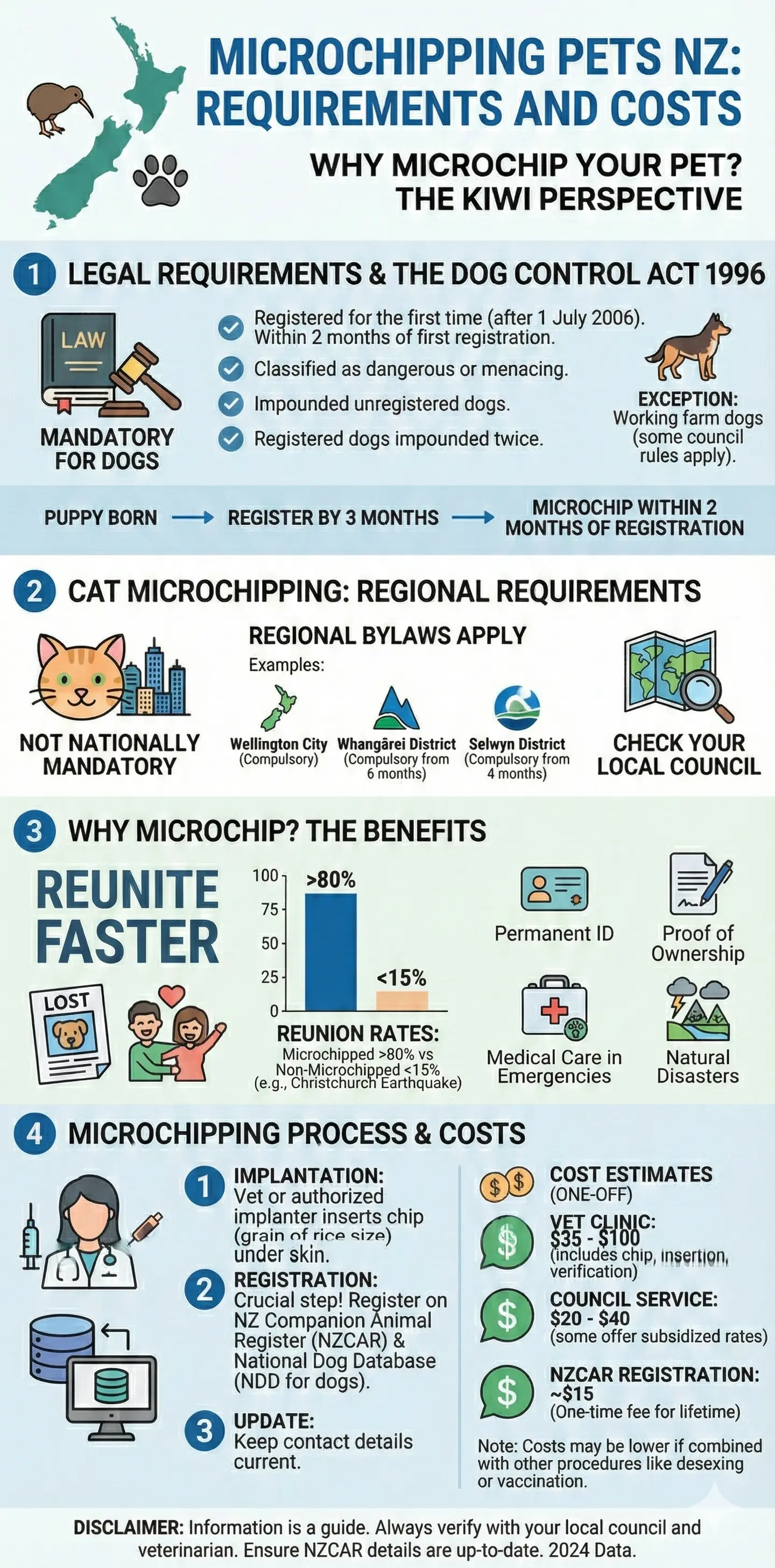 Imagine this: your beloved dog bolts out the gate during a neighbourhood walk and vanishes into the evening. Hours turn into days of frantic searching, posters everywhere, and that sinking feeling in your stomach. But then, a kind stranger finds your pup, scans the tiny microchip under their skin, and you're reunited in minutes. That's the power of microchipping—it's not just a legal must for Kiwi pet owners; it's your best defence against heartbreak. In New Zealand, where our pets are family, understanding microchipping pets NZ requirements and costs keeps everyone safe and compliant.