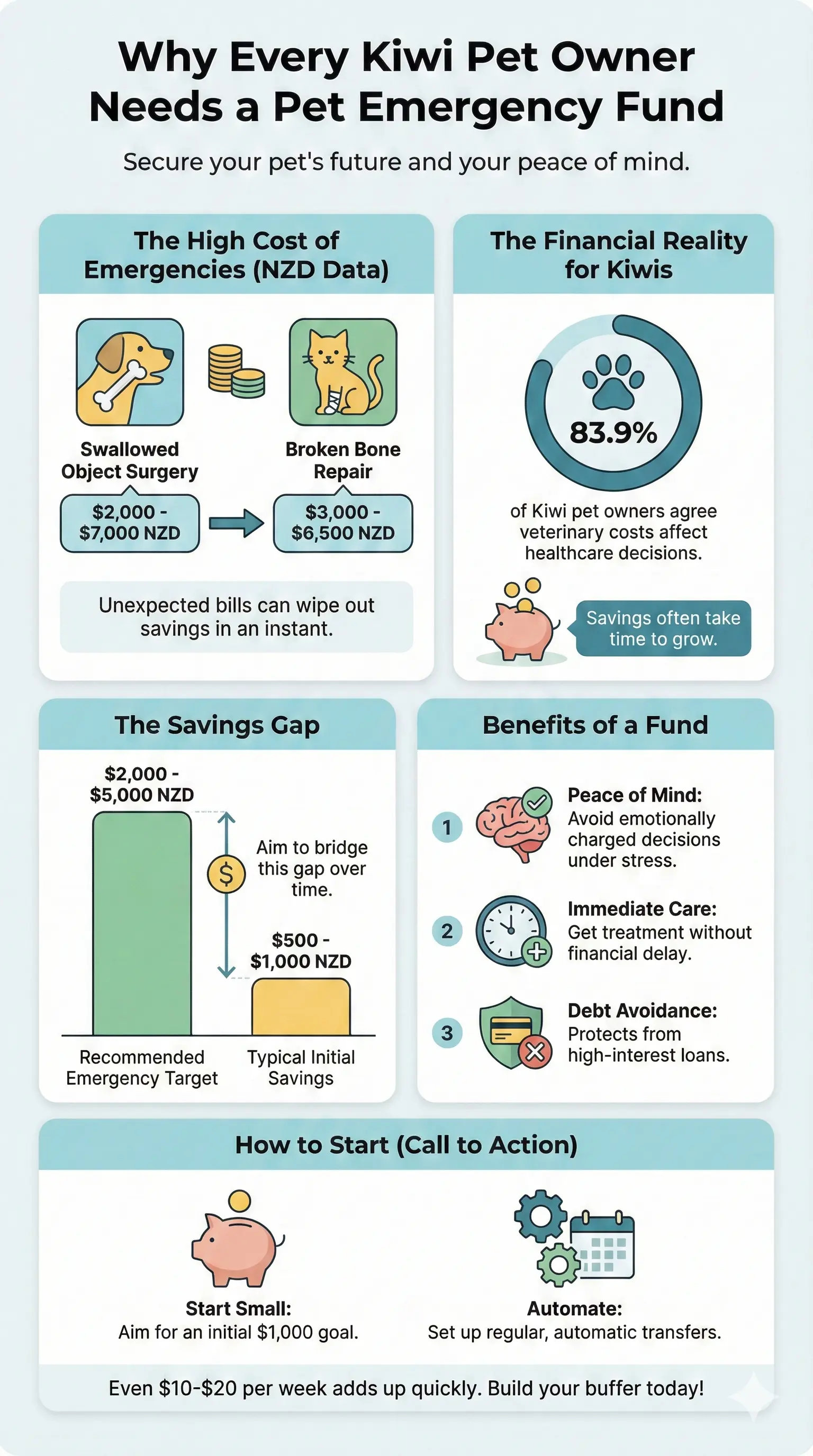 Imagine it's a stormy Friday night in Auckland, and your beloved Labrador, Max, suddenly starts yelping in pain from a twisted paw after chasing a ball too enthusiastically. The vet bill hits $2,500, and you're staring at an empty savings account. For Kiwis who treat pets like family, this scenario underscores why a Pet Emergency Fund: How Much to Save is essential—it's your safety net against unexpected crises that can drain your wallet fast.