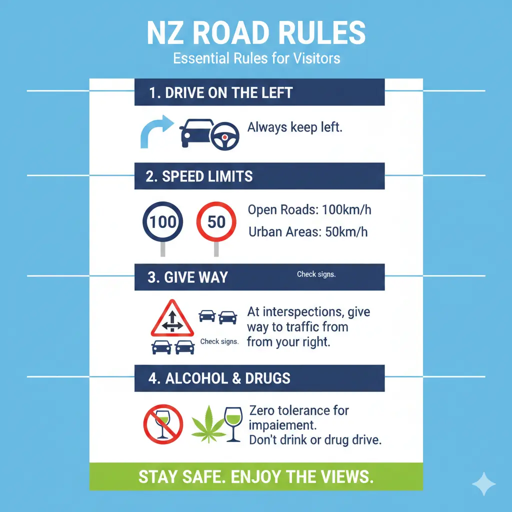 - Fatigue: No driving over 2 hours without a 15-min break. Share wheel on long hauls like Auckland to Queenstown.