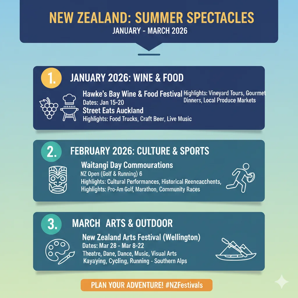 Marlborough's wine region gears up for harvest, with the Marlborough Heritage Festival blending history and vintages. Sports fans anticipate Cruden Park showdowns and ITM Taupo SuperSprint (likely October) for V8 thrills. Foodies eye Electric Avenue Festival (27 February, late summer spill) with Becky Hill, but spring whispers of Bay of Plenty's ongoing flavours.