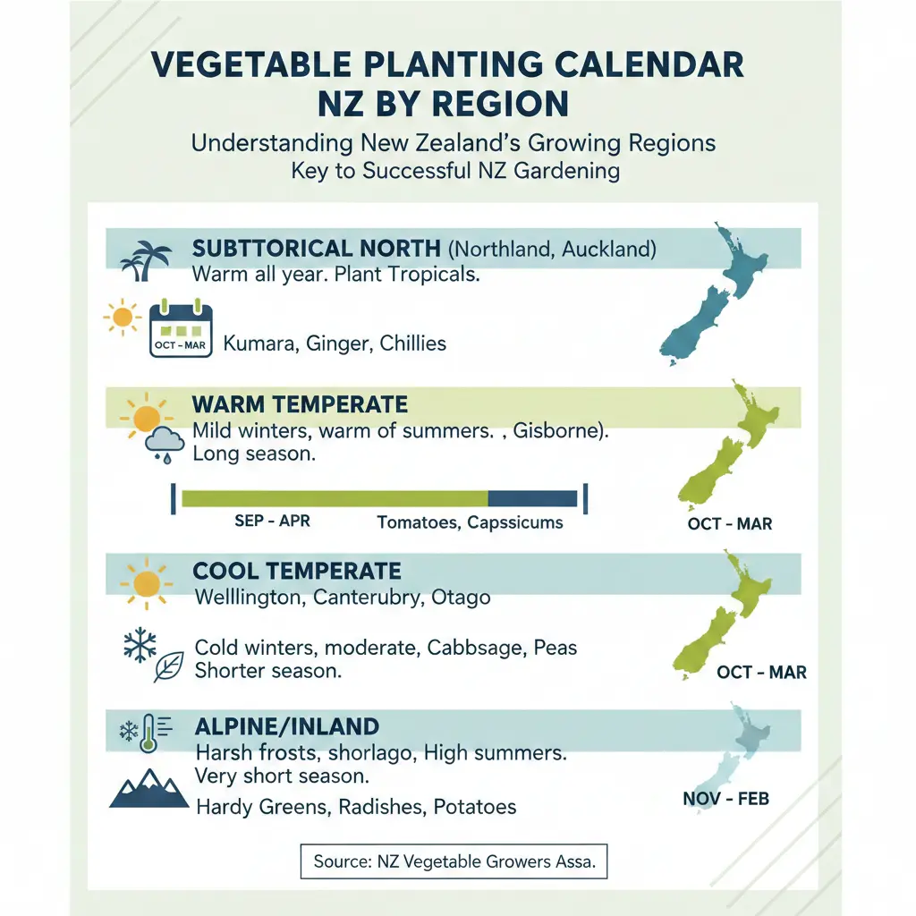 Blend zones—e.g., coastal Canterbury follows temperate more than inland. Check local frost dates on Metservice.