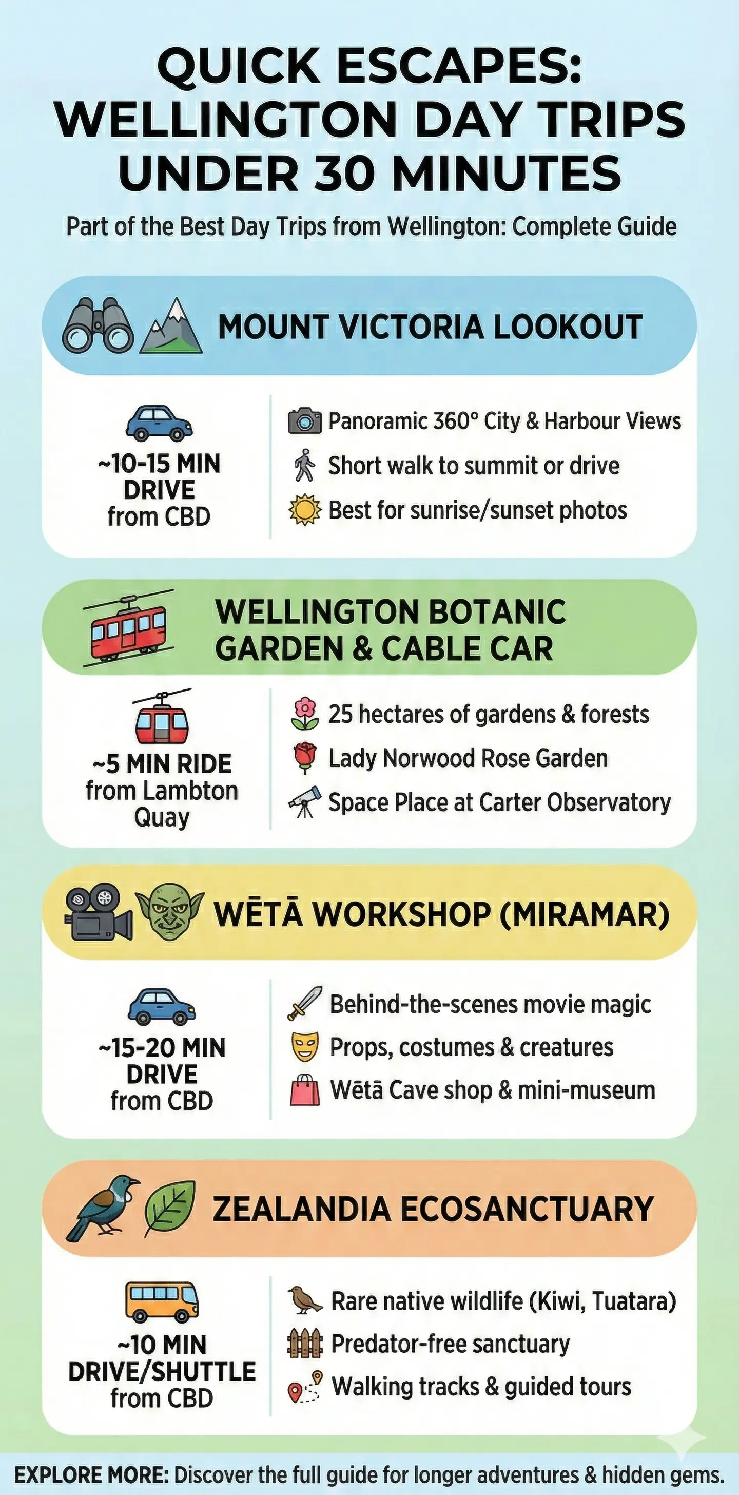 Weta Cave and Workshop is your best bet—it's just 15 minutes from the CBD and takes about 1–2 hours to explore. Alternatively, Zealandia or Red Rocks are great for a quick nature fix.