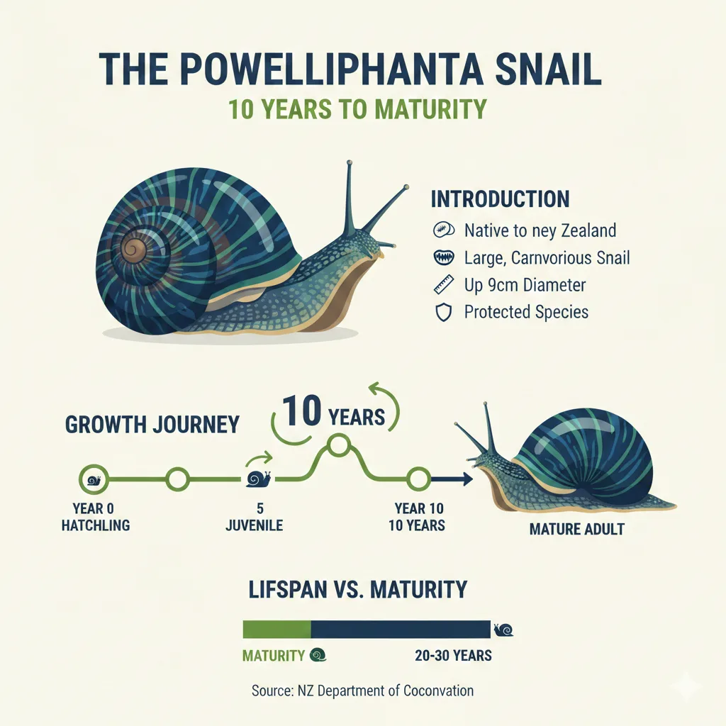 - Slow growth rate: The Powelliphanta snail takes up to 10 years to reach maturity, making it one of the slowest-growing land snails in the world.